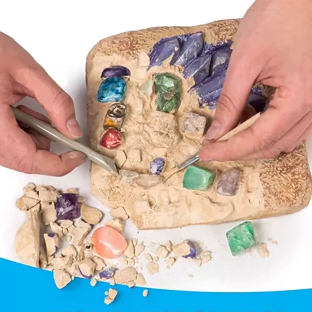 Com ele, as crianças podem cavar e revelar pedras preciosas e cristais reais, transformando aprendizado em diversão e despertando a curiosidade científica de forma prática e envolvente.